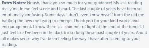“I just received an incredible reading that was relevant and received in divine timing. I am super impressed with the details and being spot on considering the very little information I provided. Definitely and highly recommend.”